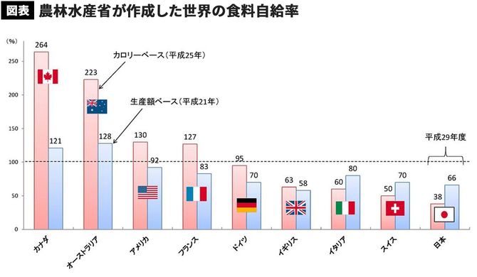 日本の食料自給率は本当に低いのか。拓殖大学国際学部教授の竹下正哲氏は「日本の食料自給率は38%とされているが、これは日本独自の『カロリーベース』だ。諸外国の使う『生産額ベース』では66%で決して低くない。世界でこんな奇妙な計算方法を採用している国は一つもない」という――。