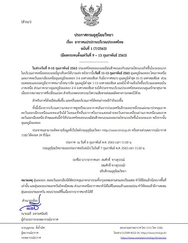 กรมอุตุฯ / วันที่ 6 ก.พ. ประกาศ กรมอุตุนิยมวิทยา "อากาศแปรปรวนบริเวณประเทศไทย(มีผลกระทบตั้งแต่วันที่ 9-13 กุมภาพันธ์ 2563)" ฉบับที่ 1 ลงวันที่ 6 กุมภาพันธ์ 2563 ในช่วงวันที่ 9-10 กุมภาพันธ์ 2563 ประเทศไทยตอนบนจะมีฝนฟ้าคะนองกับลมกระโชกแรงเกิดขึ้นในระยะแรก ในบริเวณภาคเหนือตอนบนจะมีลูกเห็บตกได้บางแห่ง หลังจากนั้นวันที่ 11-13 กุมภาพันธ์ 2563 อุณหภูมิจะลดลง โดยภาคเหนือและภาคตะวันออกเฉียงเหนืออุณหภูมิจะลดลง 3-6 องศาเซลเซียส กับมีอากาศหนาว อุณหภูมิต่ำสุด 10-15 องศาเซลเซียส
