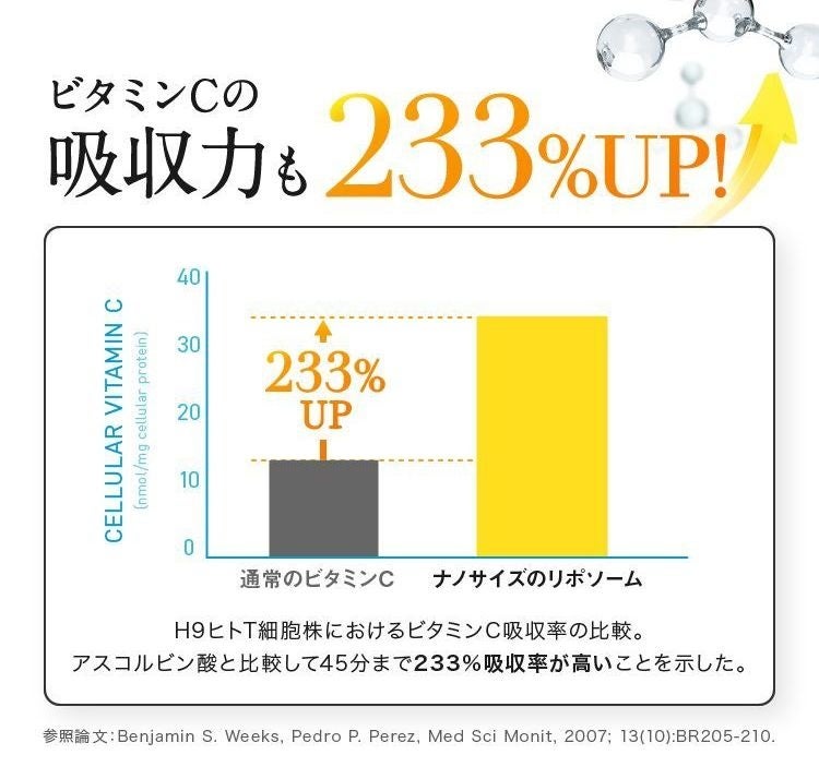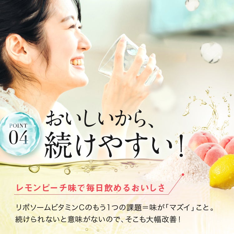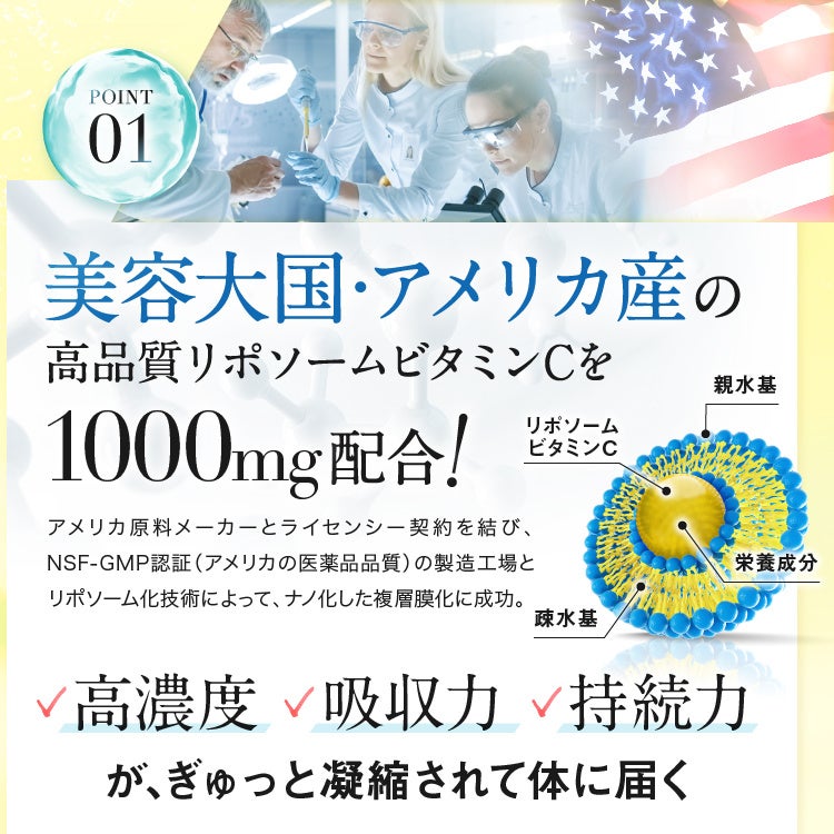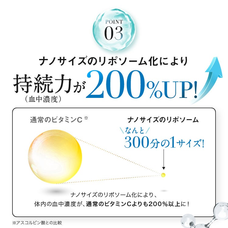 通常のビタミンCよりも吸収率、持続率が2倍以上高い「リポソーム型ビタミンC」を採用しています。