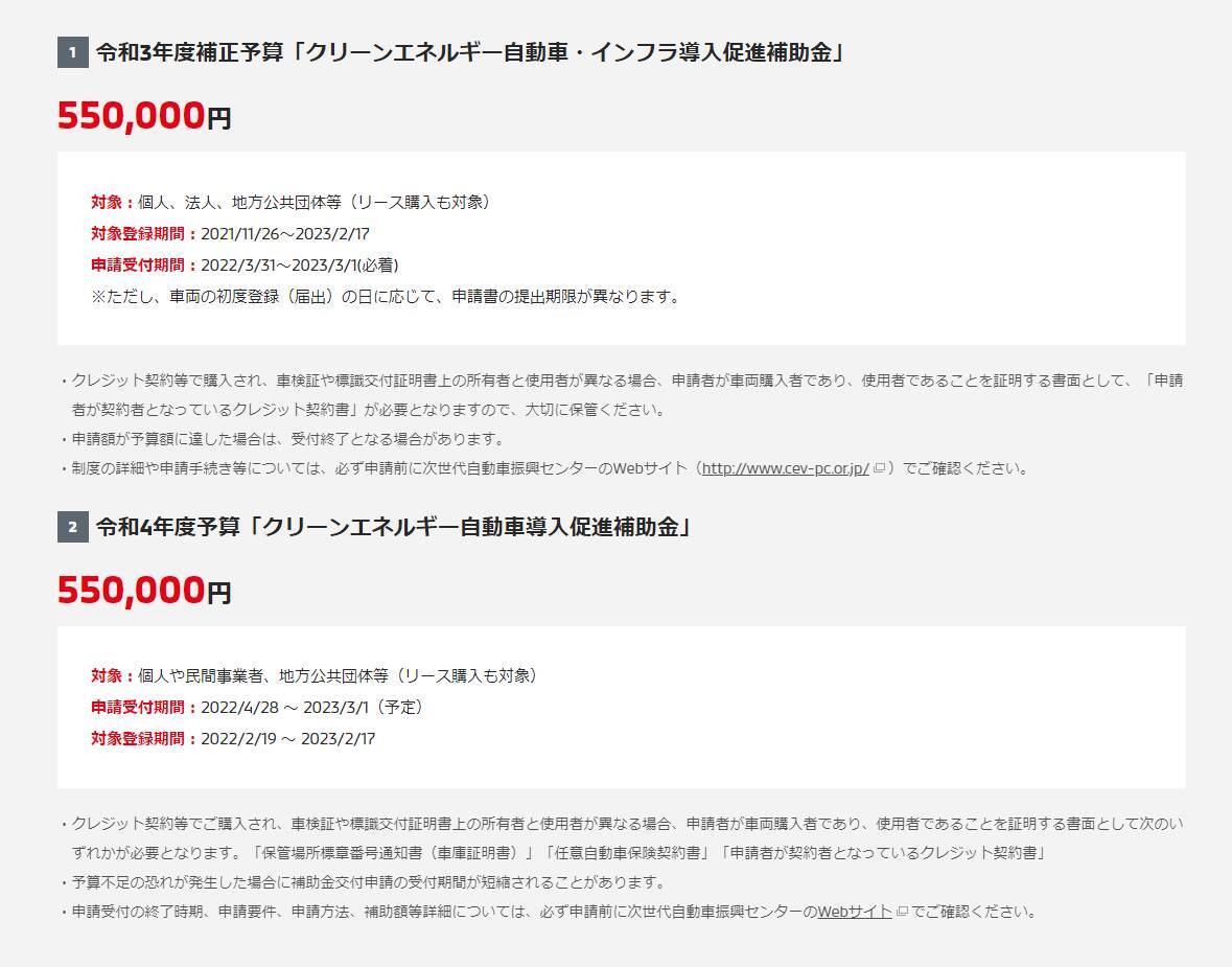 まずはPHEVを買うとどのような補助金が受けられるのか、ということについてチェックしていきます。令和4年(2022)年度に国が展開している施策として「クリーンエネルギー自動車導入促進補助金」があり、これに該当する車を購入すると55万円の補助金が受けられます。