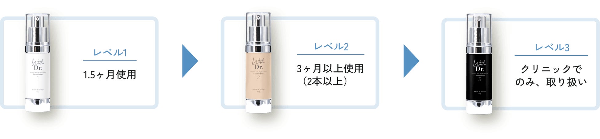 他社ビタミンA配合化粧品は、アイテム数が非常に多く、どれを選べば良いかわかりにくいことが多かったと思います。本商品はレベル1→レベル2→レベル3と進んでいくだけですのでとてもわかりやすく、初心者でも使いやすいシステムとなっています。