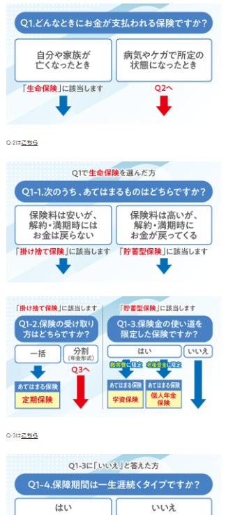 フローチャートで質問に答えていくと、たくさんある生命保険・医療保険の種類の名前と、それぞれの違いがわかるようになっています。