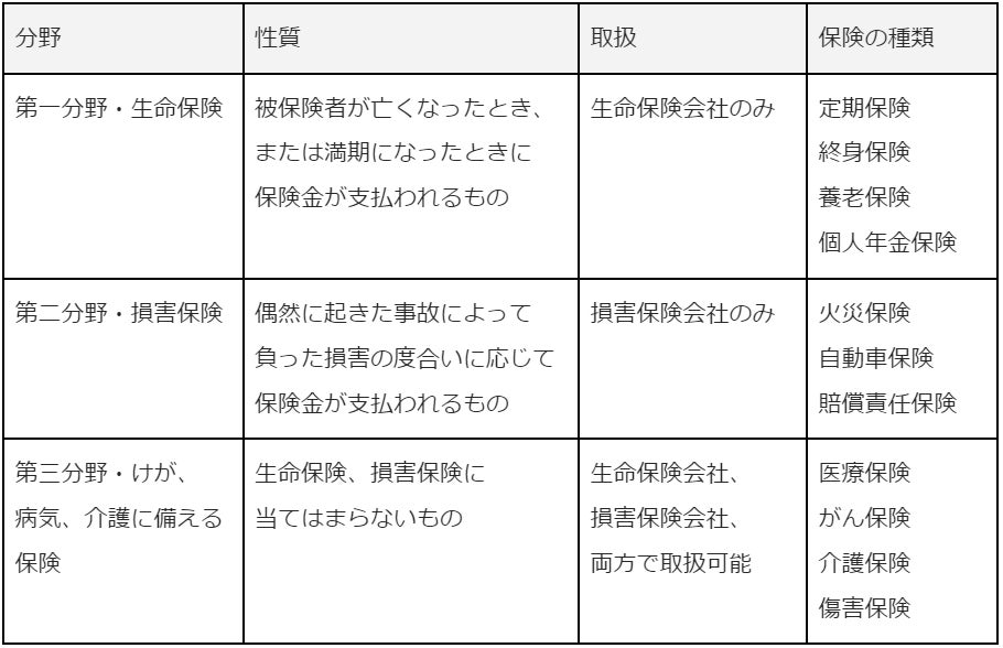 保険の種類は保険業法によって決められています。その種類によって3つの分野があり、それぞれ取り扱いができる保険会社が決まっています。