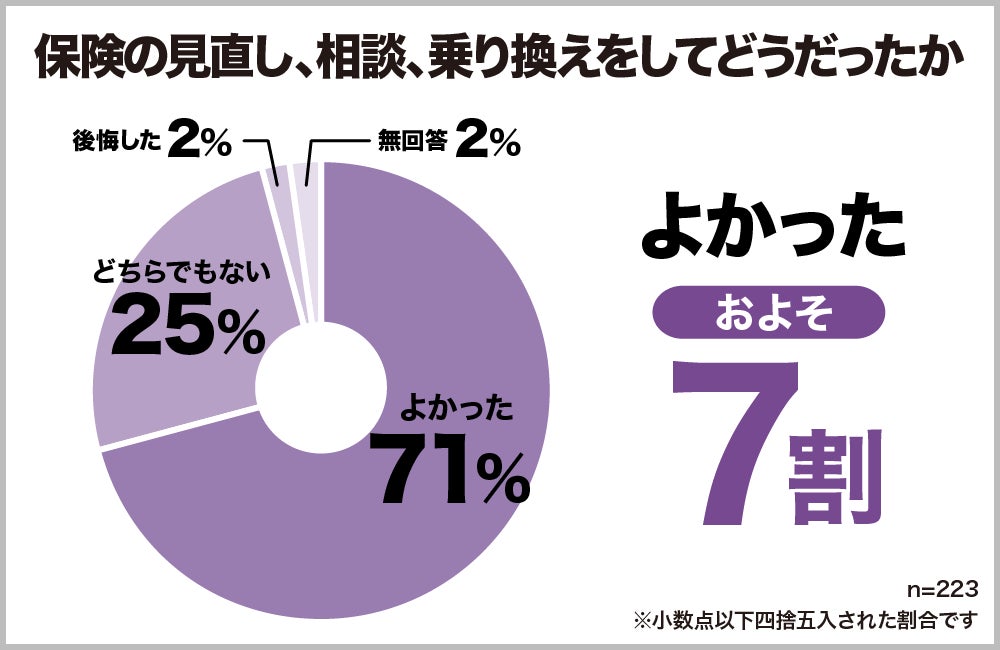 保険を見直した結果、満足できたと答えている人は7割を超えています。思い切って見直して良かったと感じている人が多いですね。後悔している人はわずか2%でした。