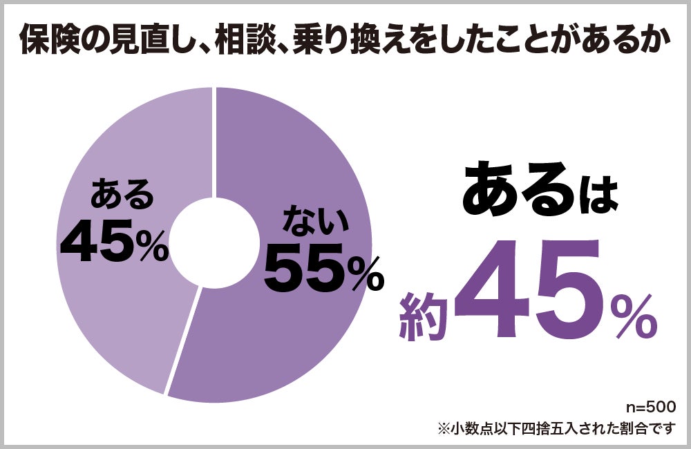保険を見直したことのあるという人は、全体の45%でした。およそ半数ですが、見直したことのない人の方が若干多いという結果になっています。