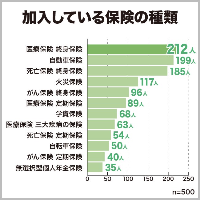 現在加入している保険の種類について聞きました。上位には病気やけがに備える医療保険が多くみられます。
