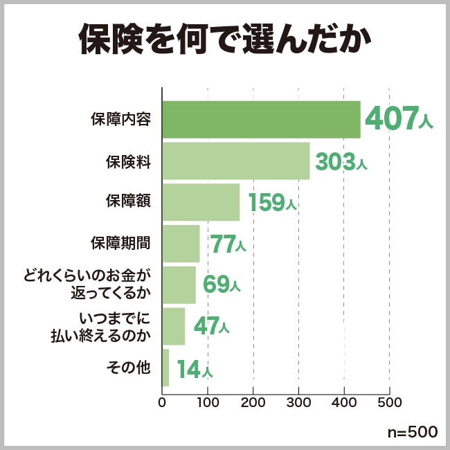 みんなはどのような理由で保険を選んでいるのか、そのポイントについても聞いてみました。保険料も大事ですが、保障内容が本当に適切なのかどうかが何より大事です。みなさん、保障内容をよく比較して選んでいるようです。