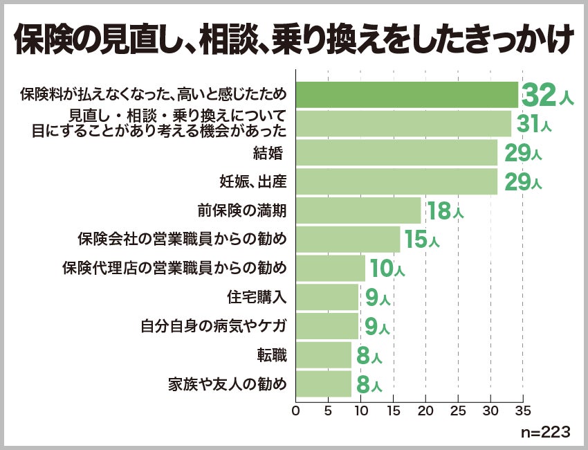 結婚や妊娠・出産を合計すると1位の回答数を上回るため、ライフステージの変化によって保険を見直そうと考える人が多いことがわかります。